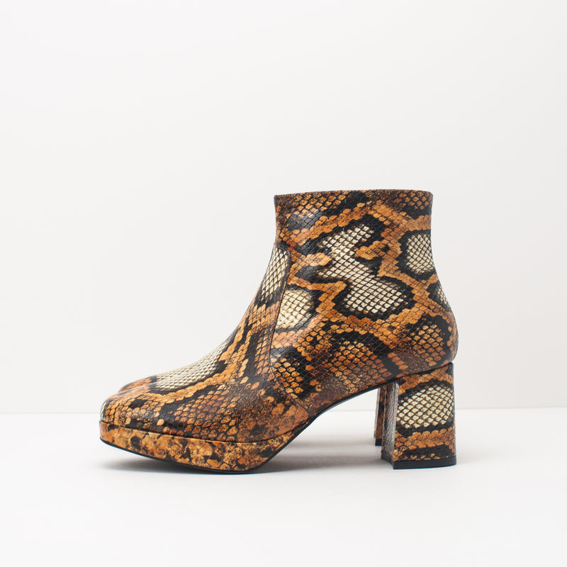 Botín Seiale modelo FOFO con estampado de serpiente. Destacamos la plataforma vista y forrada aportando un toque retro y muy noventero. Fíjate en los colores vivos y luminosos del estampado, con un print muy definido, lo que eleva la calidad de la pieza. Tacón ancho, cuadrado y de altura media, que gracias a la plataforma resta centímetros y suma comodidad.