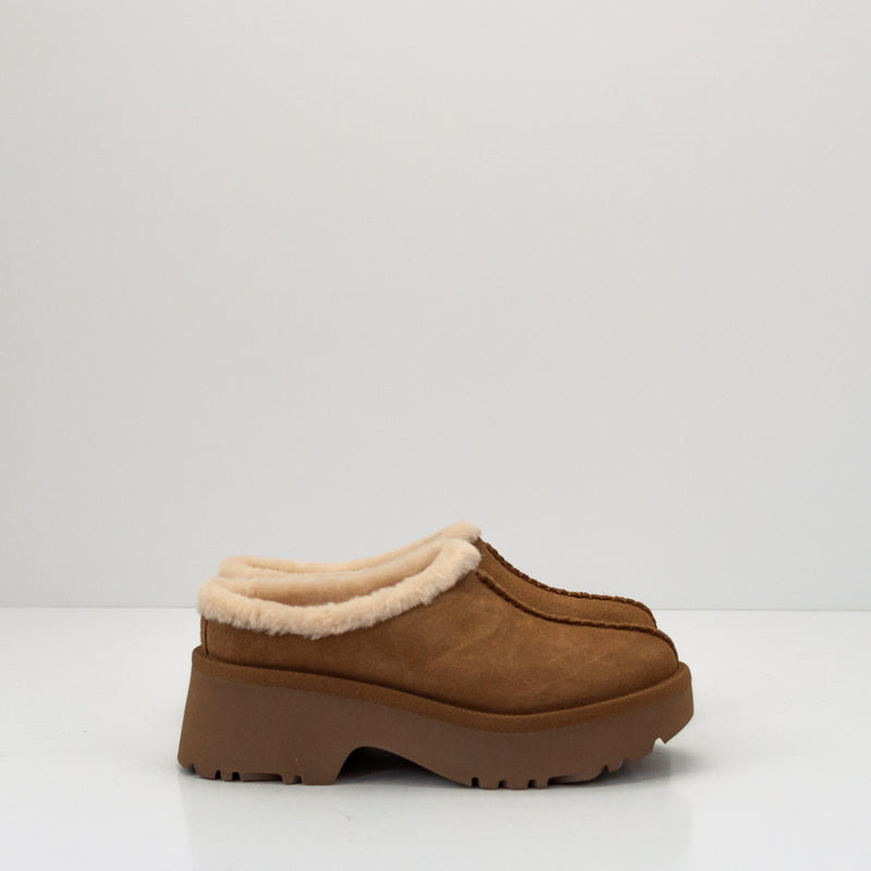 Zoco UGG en color camel con interior forrado en suave pelo, deseñado para máxima calidez. Presenta detalle de doble costura na empeña e logo termo gravado no talón. A súa plataforma e tacón aportan un toque moderno ao estilo Cozy clásico. Lixeiro, cómodo, cálido e versátil, é a elección perfecta para un look renovado e funcional.